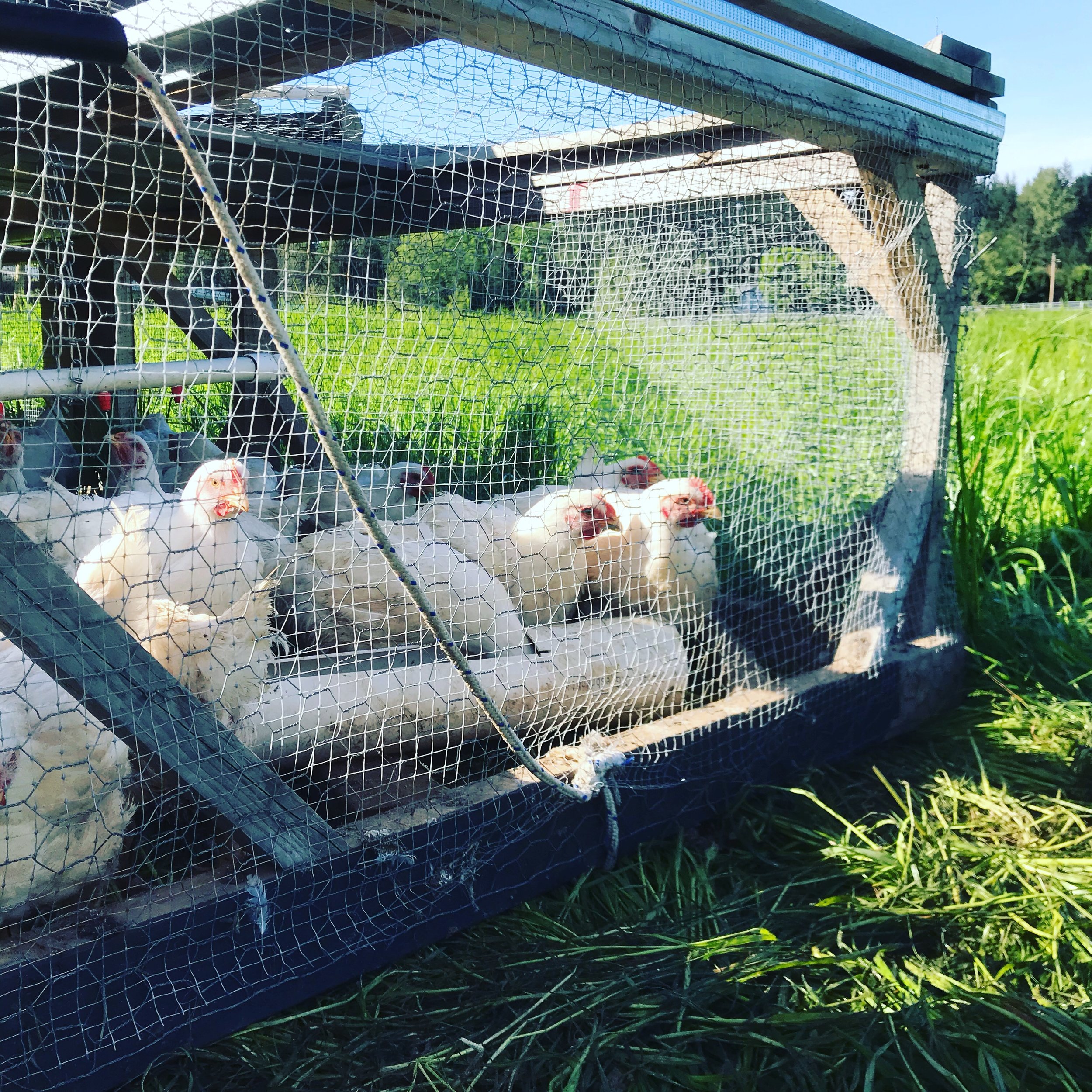 The leading principle in any pastured livestock operation is to move the animals everyday. This way we manage the concentration of their load on the pasture. This gives the grass a reset with a new layer of mulched grass and manure fertilizer. Once the birds move off the area, it is left to recover for months before another species of animal uses that ground, or another year before chickens return to that spot. The animals forage more ravenously with the excitement of being on new ground every day. They get in the habit of a fresh salad bar every morning.